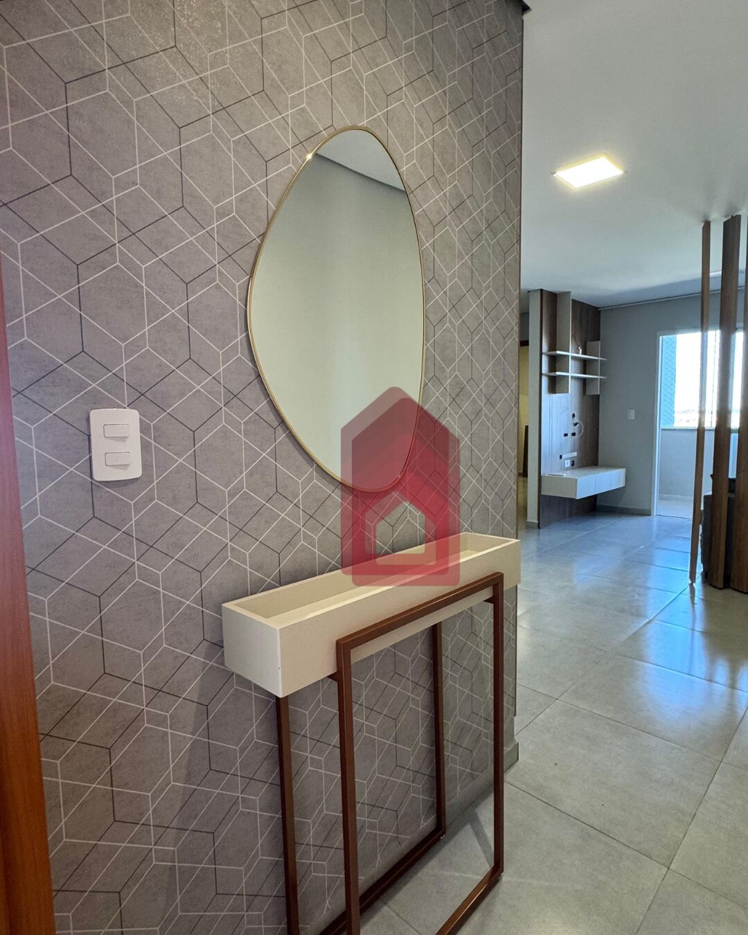 ▪️Hall de entrada com papel de parede, espelho e aparador;